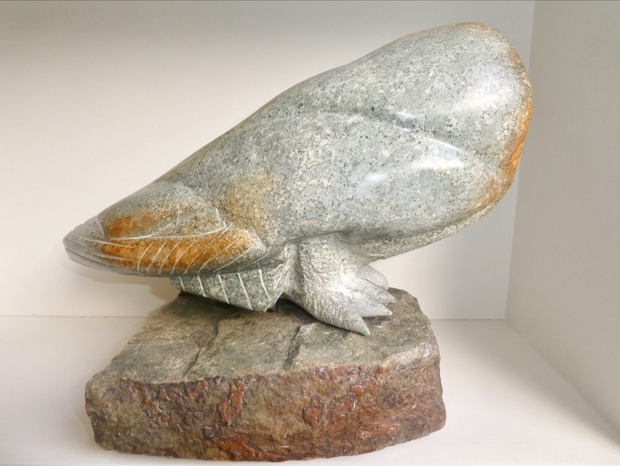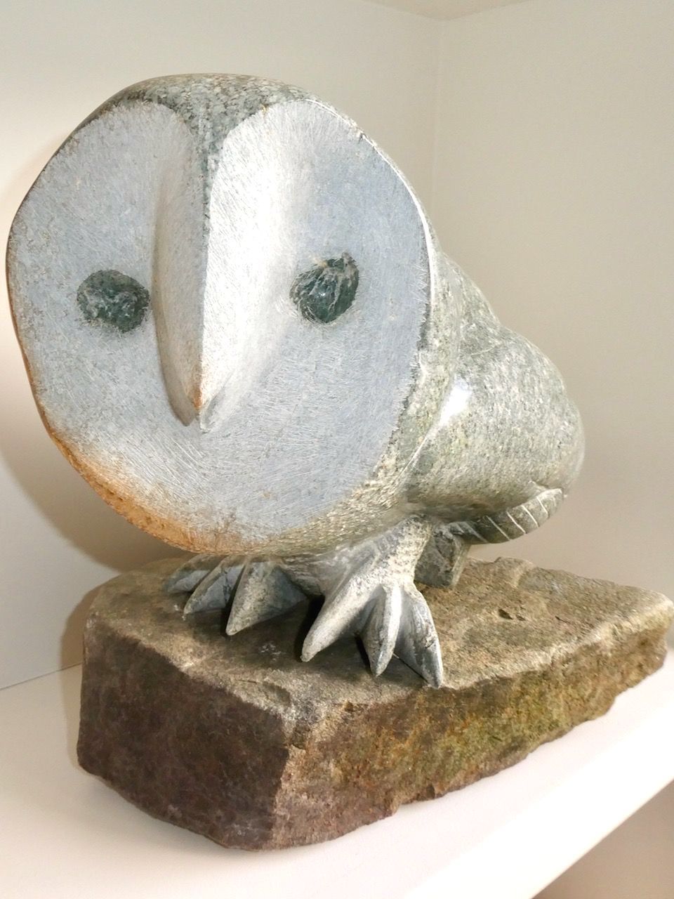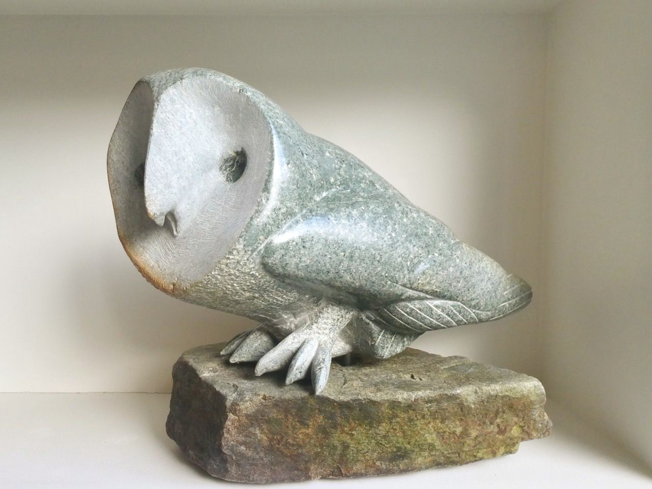 Owl. Serpentine (Zimbabwe) on stone base H27 L34 W23 14kg (accepted Green & Stone Summer Exhibition July-Aug 2025, London)