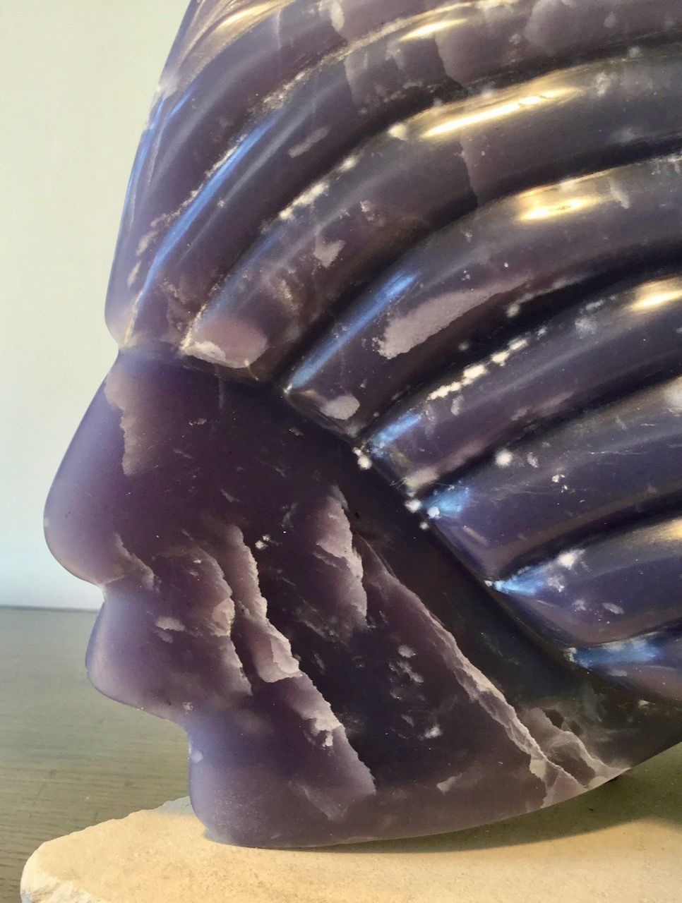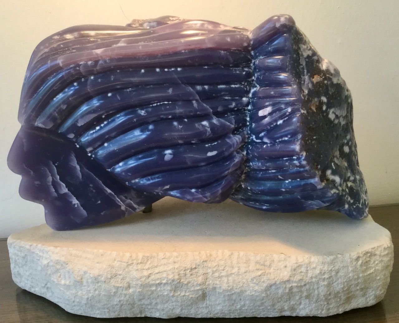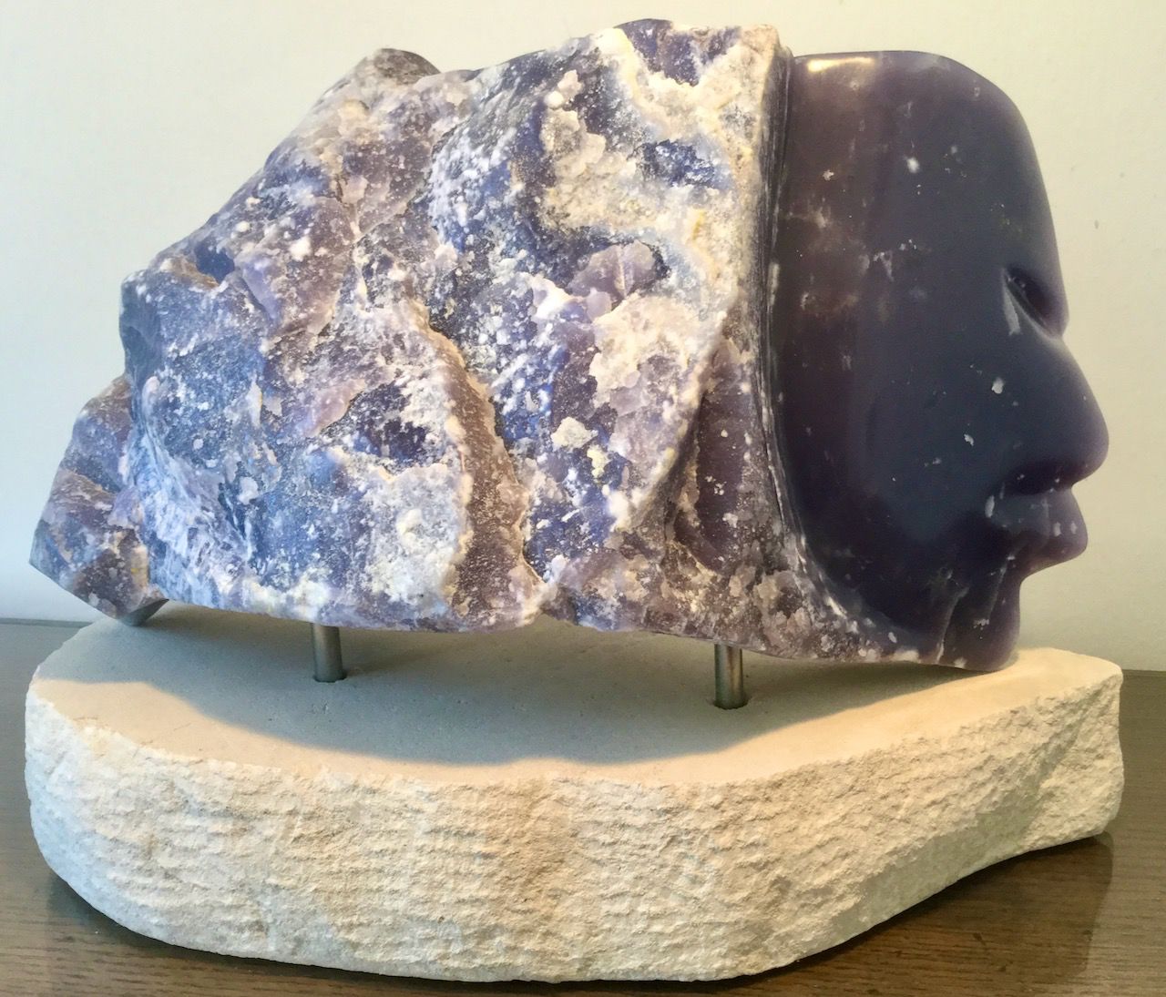 Janus. Lepidolite on Purbeck limestone base. L33 H24 W15 cm