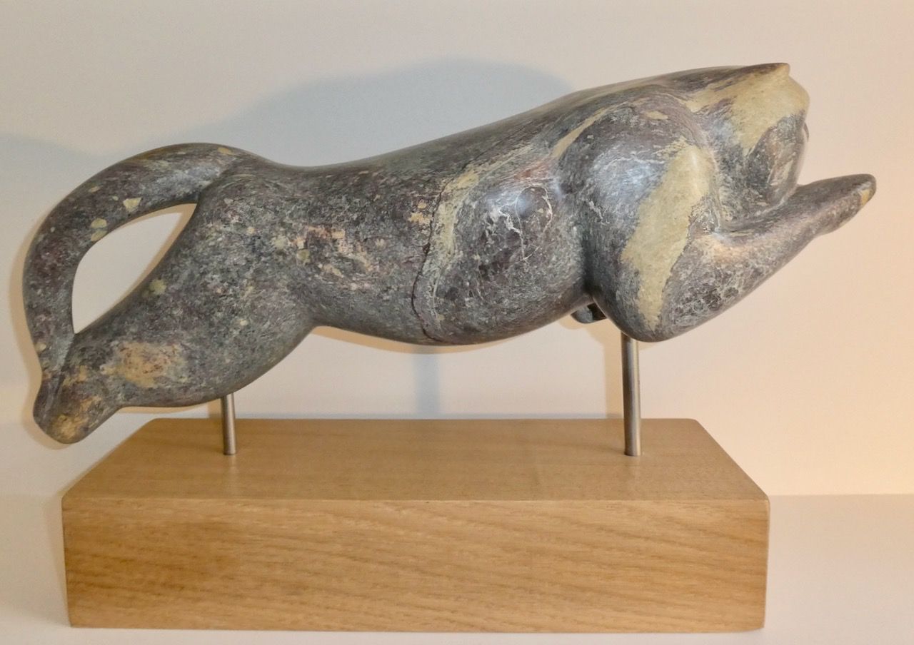 Cat. Serpentine on oak base. L46 H29 W14 cm